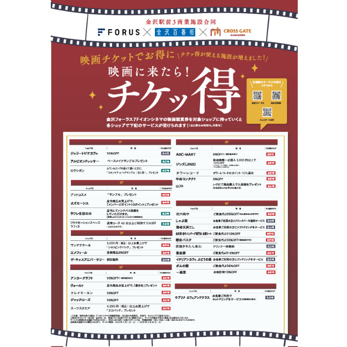 金沢フォーラス 7Fイオンシネマの映画観賞券を対象ショップに持っていくと各ショップでお得なサービスが受けられます!(当日券のみ利用可。半券可) ※内容は変更する場合がございますので予めご了承ください。