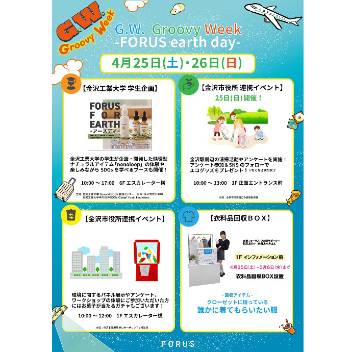 金沢フォーラスでは、4月25日(土)、26日(日)に金沢工業大学、金沢市によるイベント「FORUS earth day」を開催し、館内でSDGsに関連する様々なワークショップ・イベントを行います。
