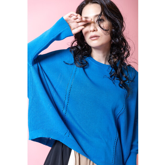 ラフな着心地ながら着痩せ効果も狙えるドルマンニットは、パンチングラインが抜け感をプラス。