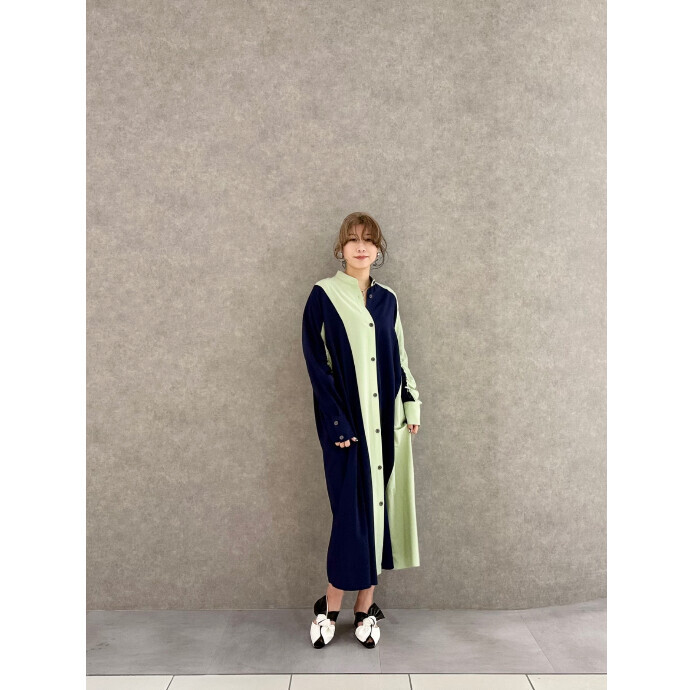 大胆に切替えたカラーやドローコードを効かせたギャザースリーブが、モードを感じるワンピース。