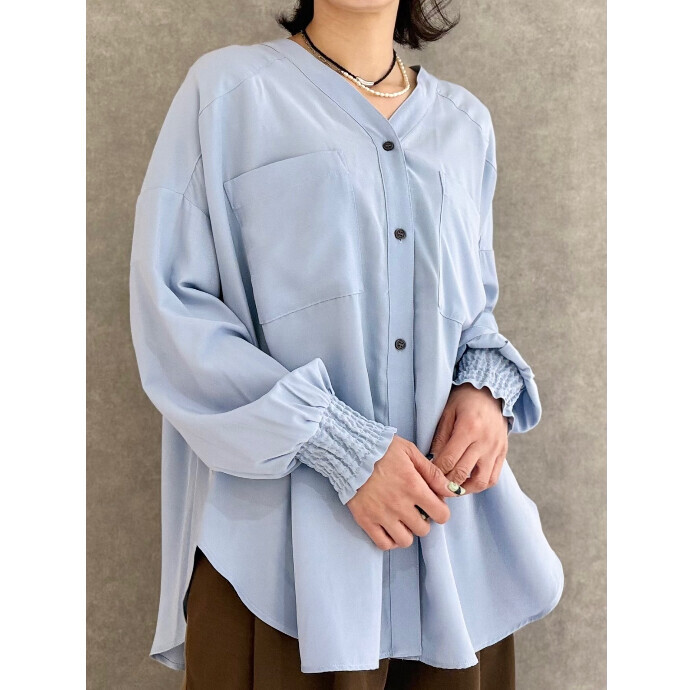 スッキリしたVネックに、袖口のギャザーやドロストヘムで甘さもプラス。