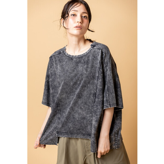 身体のラインを拾わないリラクシーなシルエットながら、サイドの切替が縦のラインを強調し洗練された印象へ。