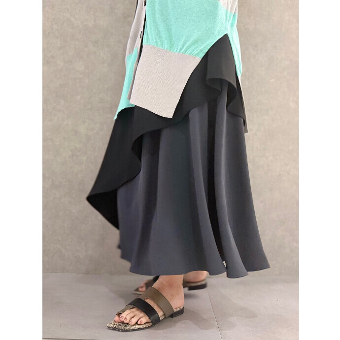 流れるようなラッフルフリルを施したスカートは、歩くたびに表情を変えるシルエットが印象的。
