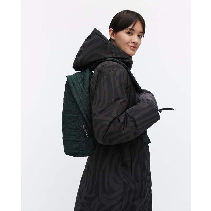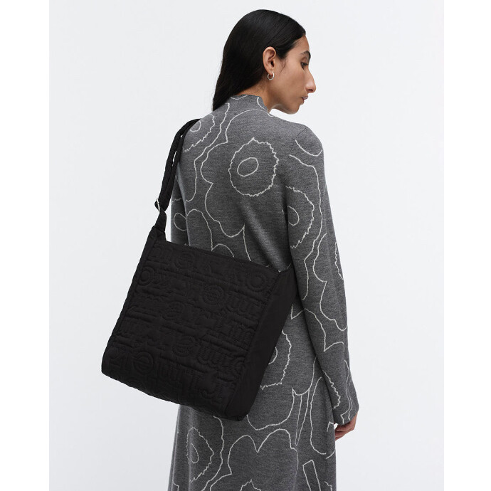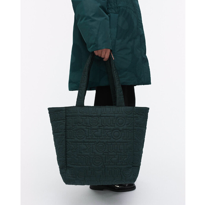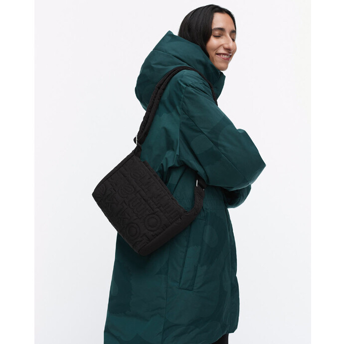 洗練されたブラックとダークグリーンの色合い、そして象徴的なマリメッコのロゴパターンが特徴です。