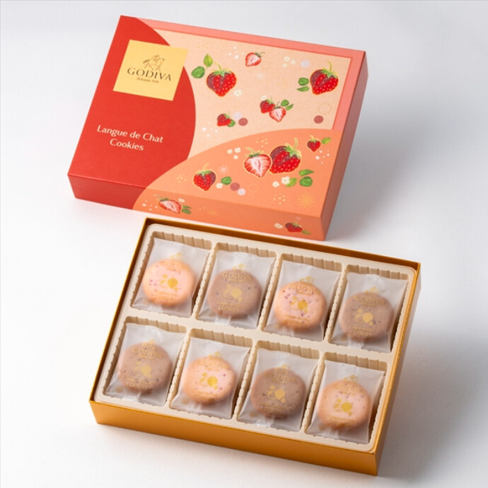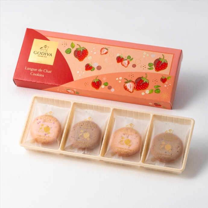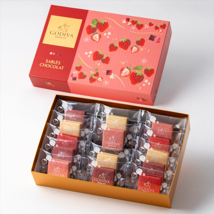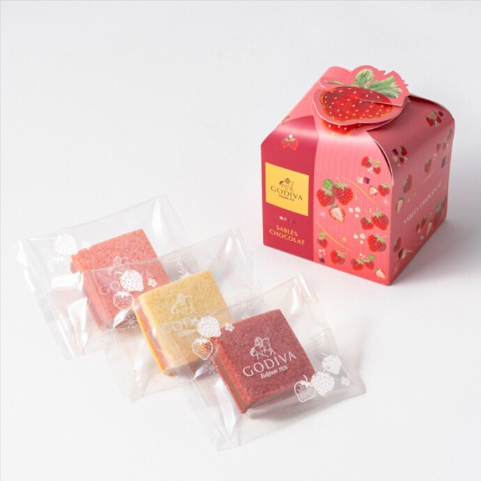 サクッと焼き上げたサブレでなめらかなチョコレートガナッシュをサンドしました。期間限定の『ストロベリー』フレーバー4種類のサブレショコラを、苺のイラストが可愛らしいボックスに詰め合わせました。