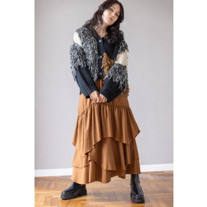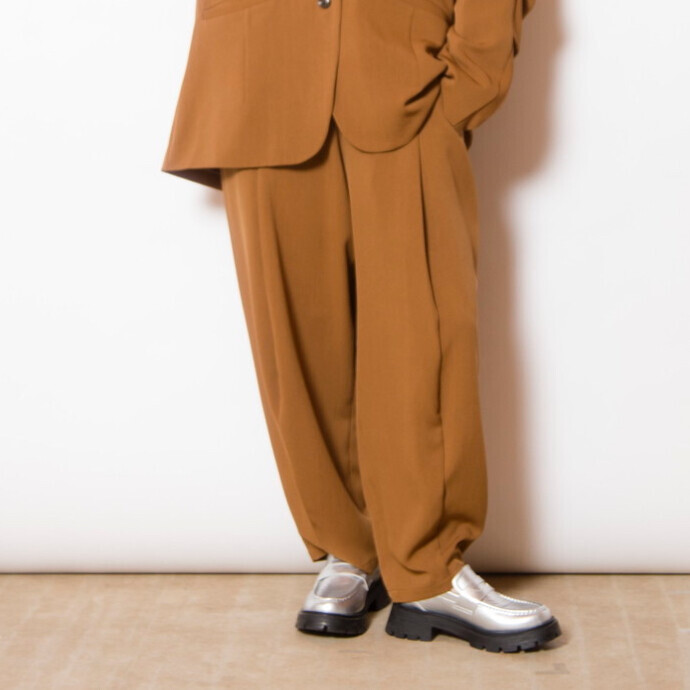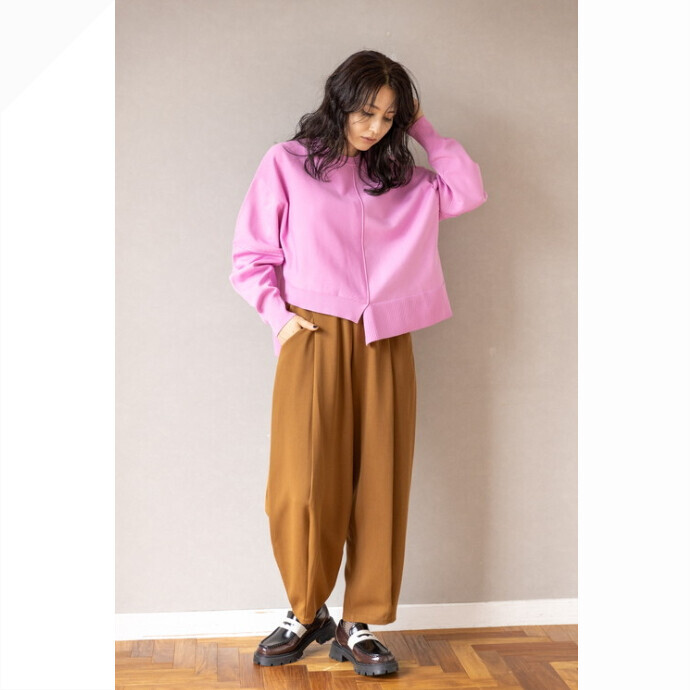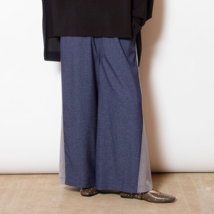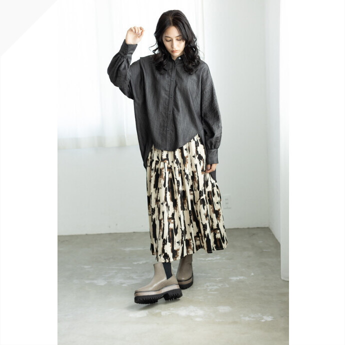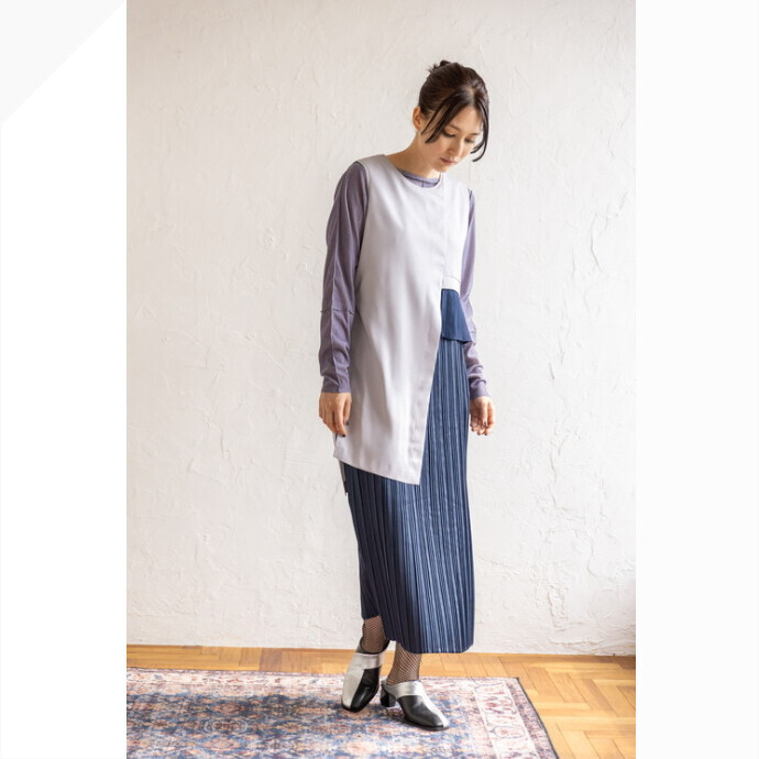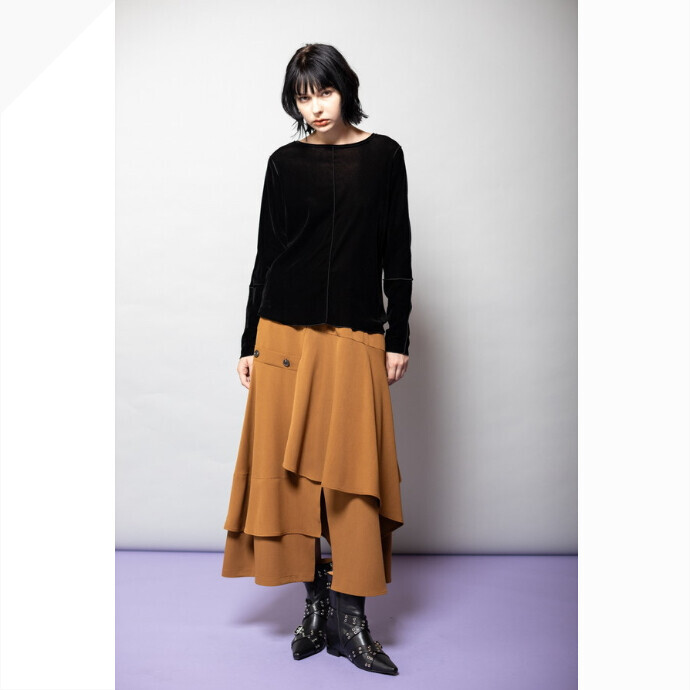 スカートをレイヤードした様なデザインボトムは、シアーの軽快さをシックな色味で落ち着かせたマニッシュな仕上がり。