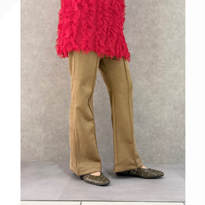 ベーシックなストレートパンツに、流れるようにフリルをデコレート。