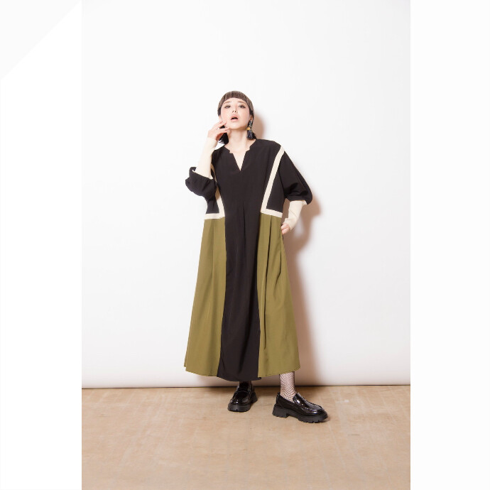 スッキリとしたキーネックと効果的なリブ使いで、自然なくびれや着痩せ効果抜群のワンピース。