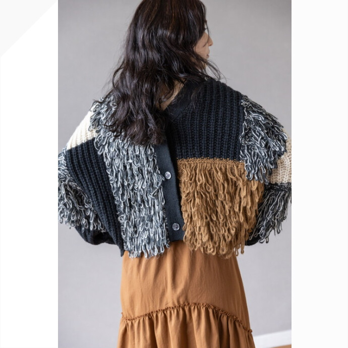 サイドにかけて大きく捻じった裾が、独創的なドレープを生むニットカーディガン。