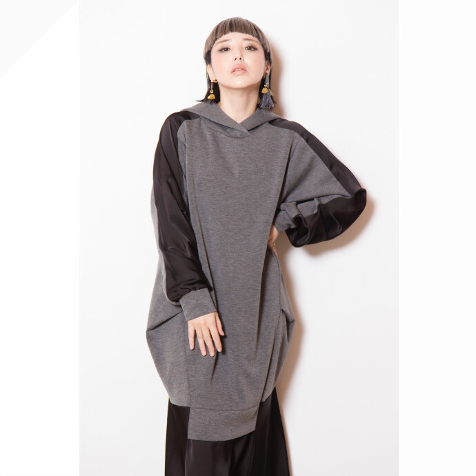 スポーティなフーディワンピースは、異素材切替や立体感のあるデザインを採用し、大人モードな印象に。
