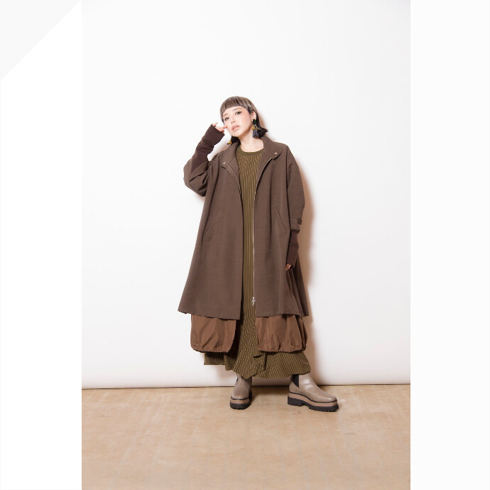 レトロなスタンドカラーコートの裾から、コクーンヘムをレイヤード。
