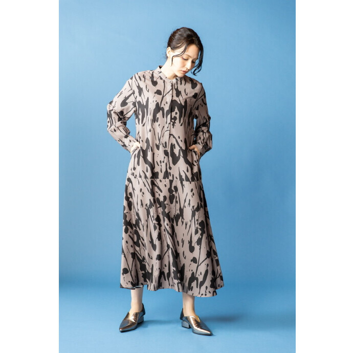 オーバーなBOXシルエットのワンピースながら、ストライプやプリーツ使いで縦ラインを強調し、全体がスッキリとした印象に。