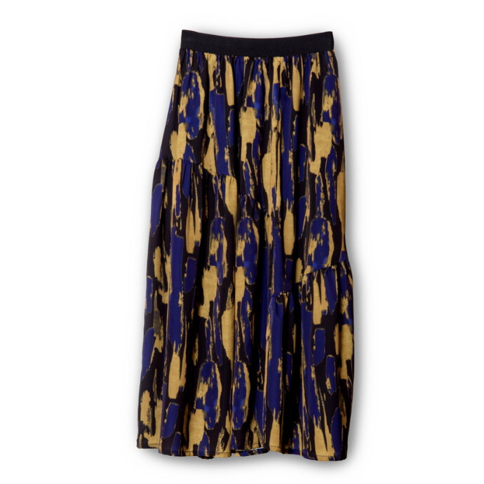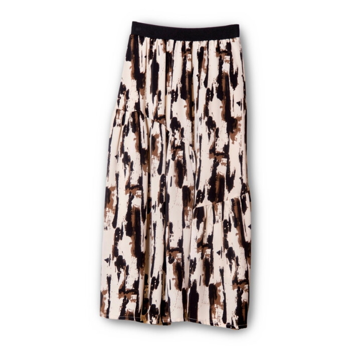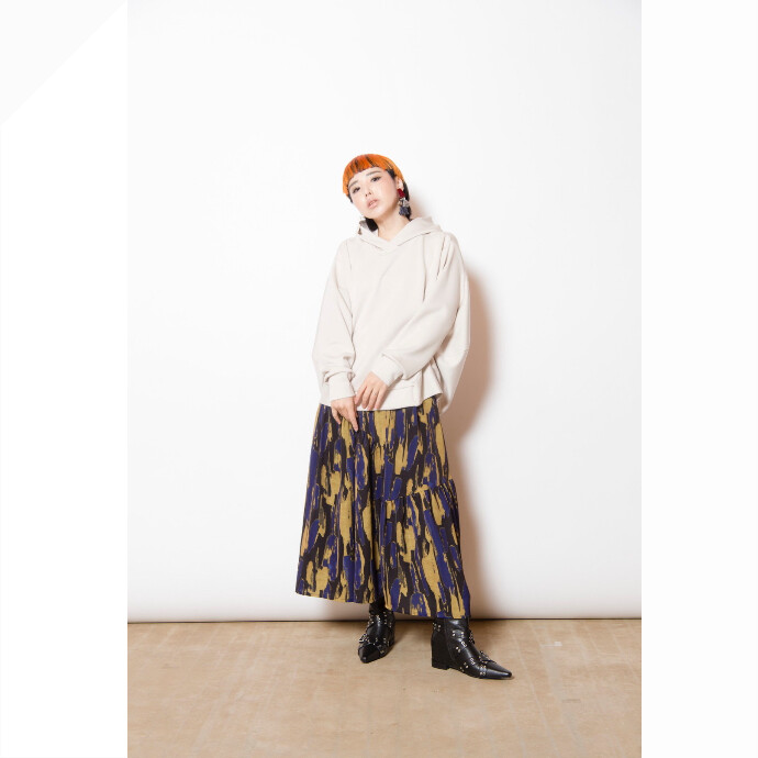 秋冬らしいトーンのプリントに、アシメに入れたギャザーがレトロシックなスカート。