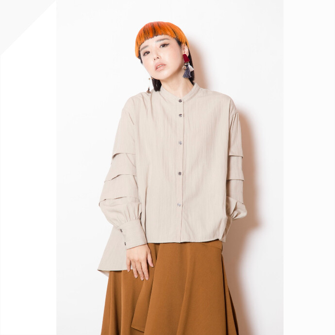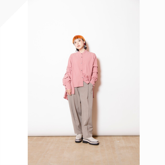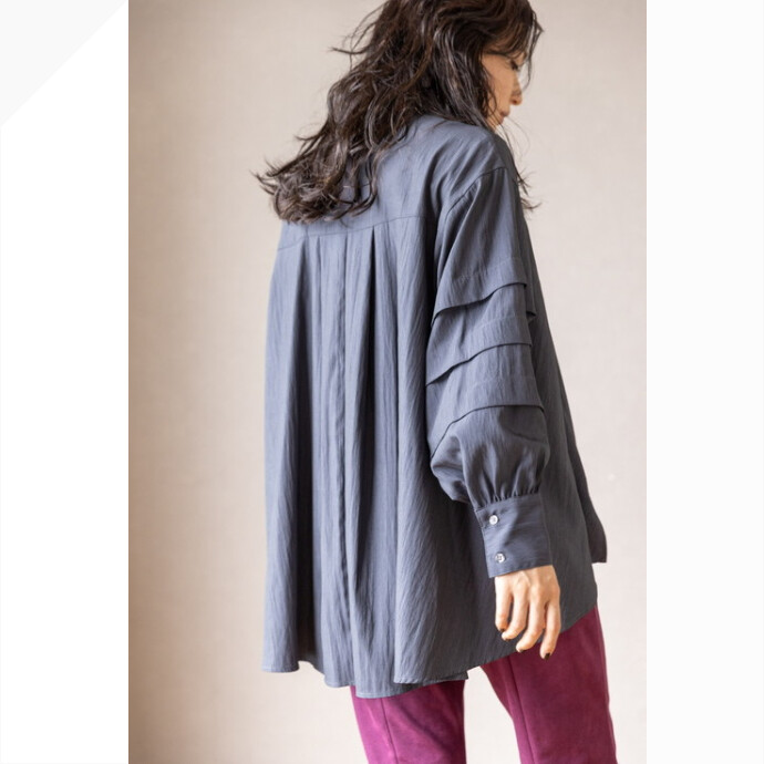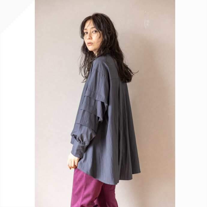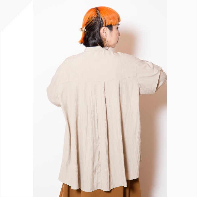 素材について: 表面にナチュラルなシワ、柔らかさとナイロン混特有のコシを感じるブラウス地