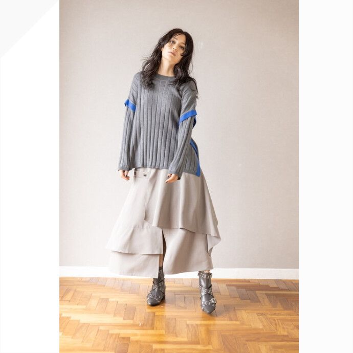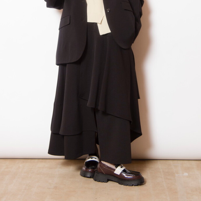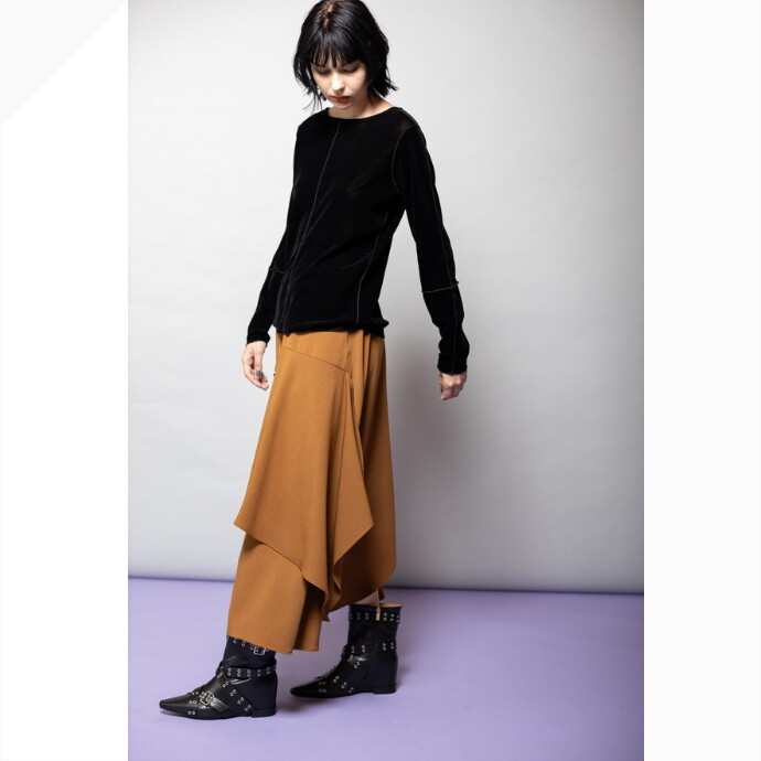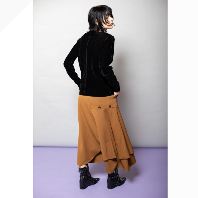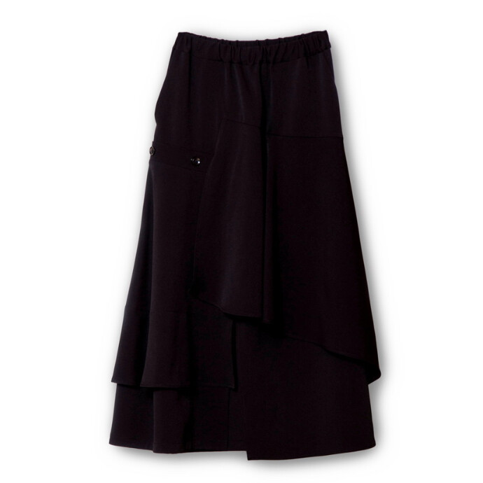 甘さに傾かないハンサムなティアードスカートは、アシンメトリーとランダムヘムが生み出す。