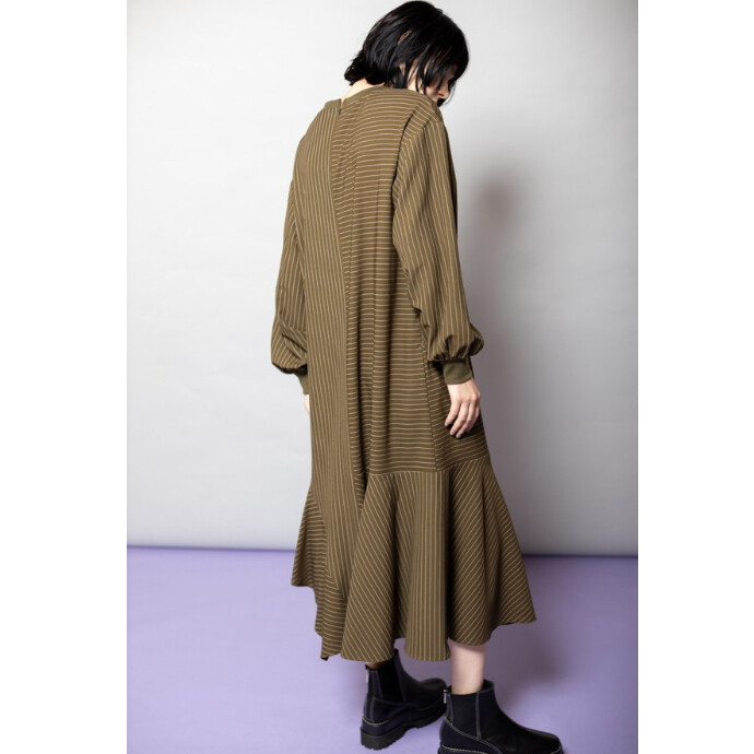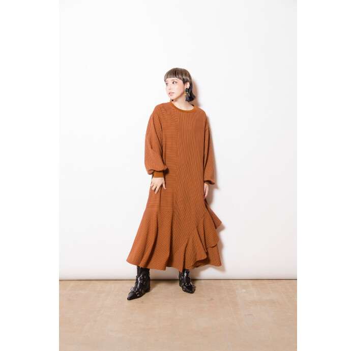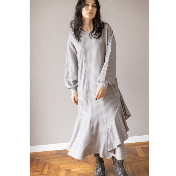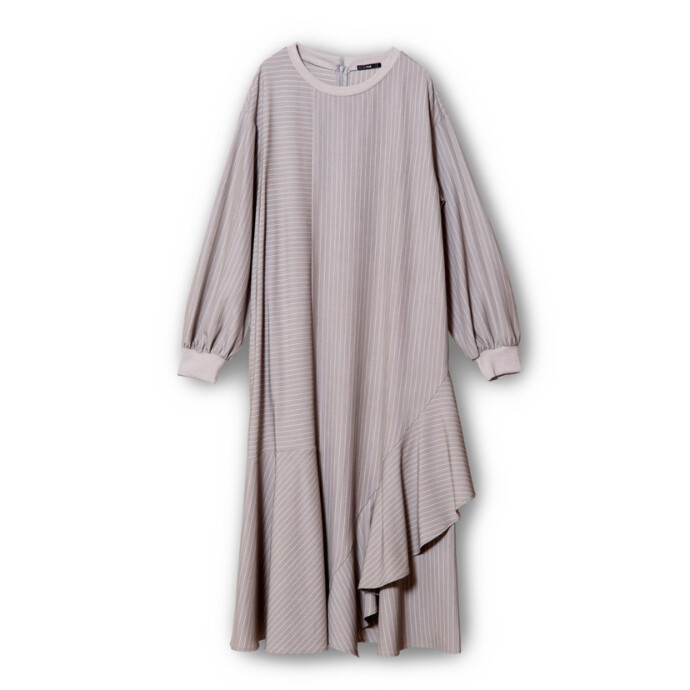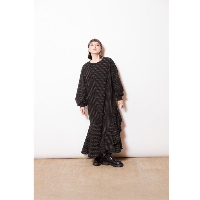 グッドガールなストライプワンピースは、フリルの甘さをモードな切替が程よくビターに仕上げ、1枚でドラマを感じさせる。