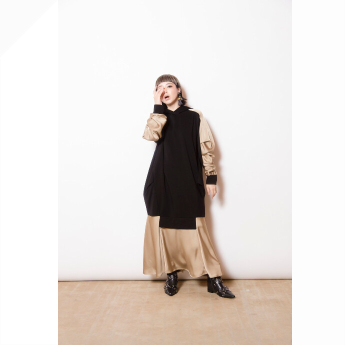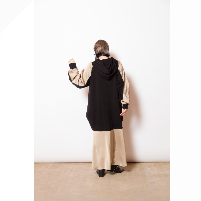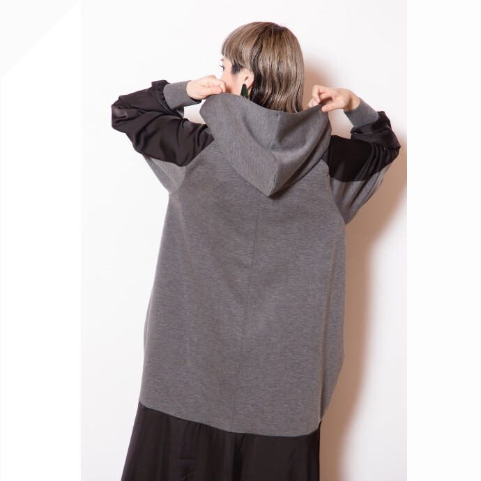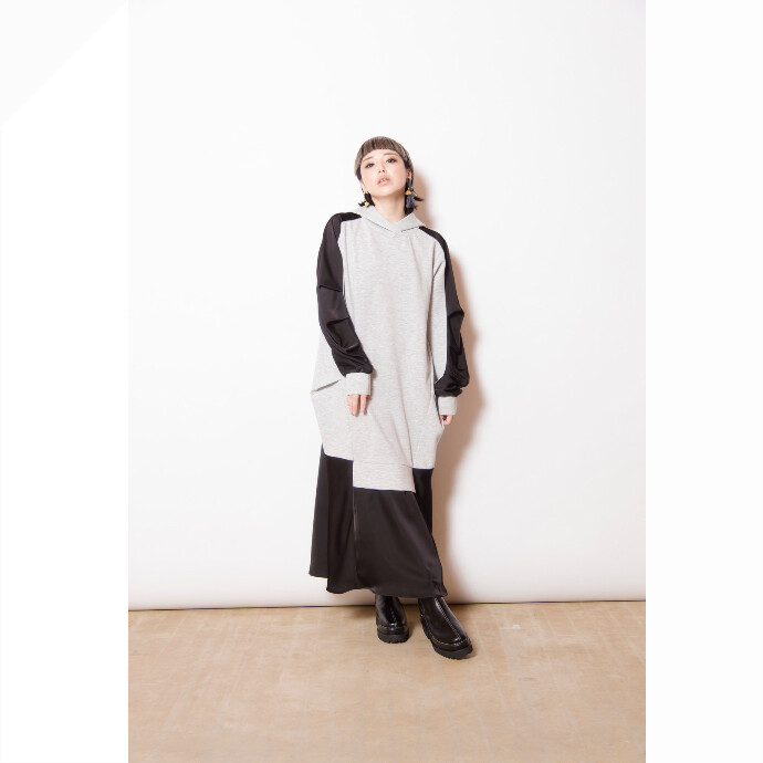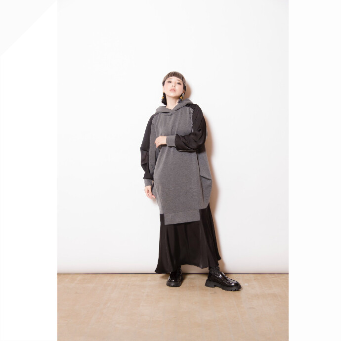 スポーティなフーディワンピースは、異素材切替や立体感のあるデザインを採用し、大人モードな印象に。