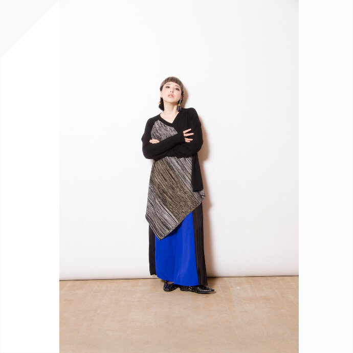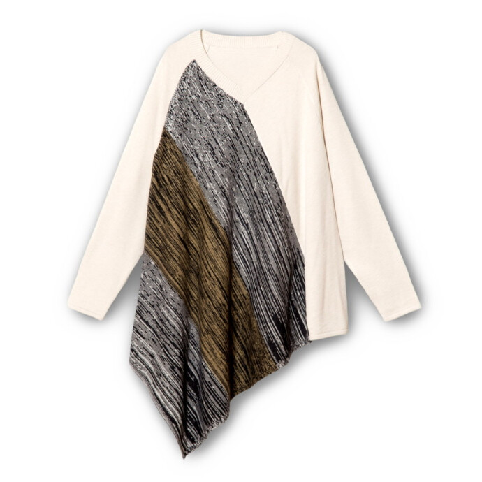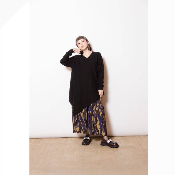 ?Xネックと直線的なアシンメトリーのシルエットが体型カバーにも効く。