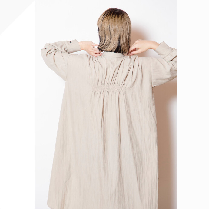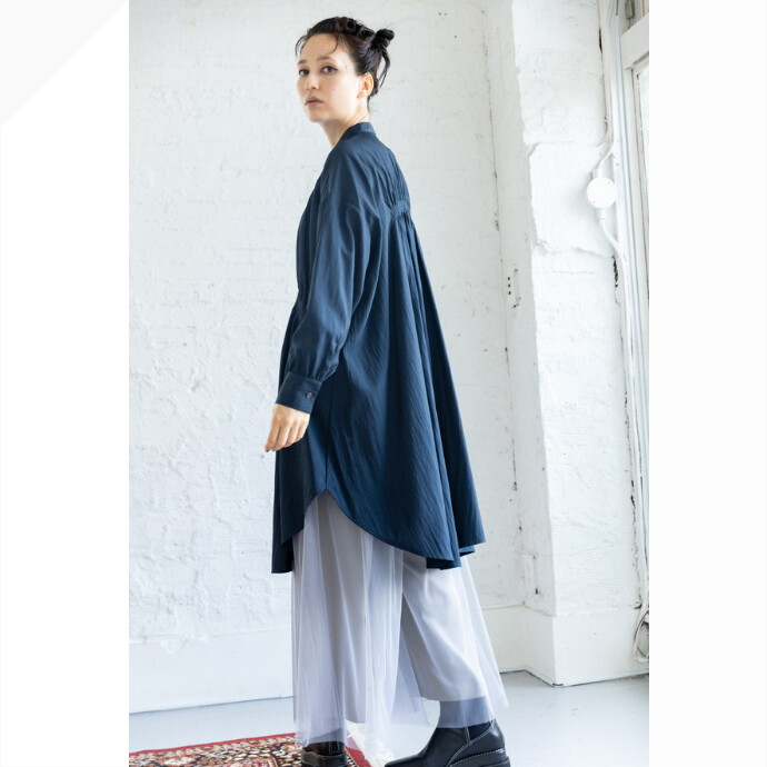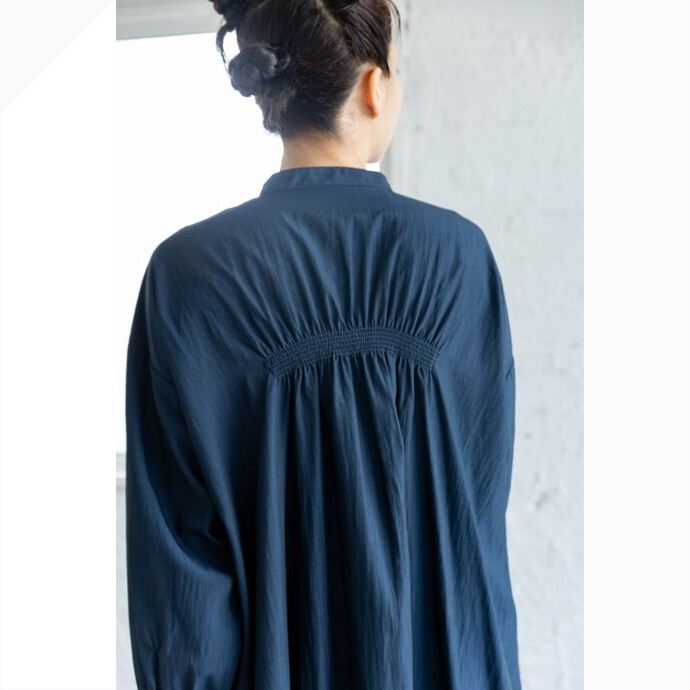 素材について: 表面にナチュラルなシワ、柔らかさとナイロン混特有のコシを感じるブラウス地