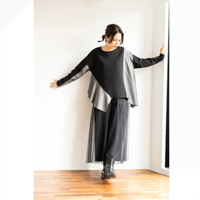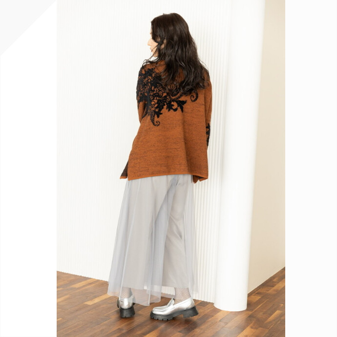 軽やかなワイドシルエットにチュールを重ね、ビターな甘さに抑えたパンツ。
