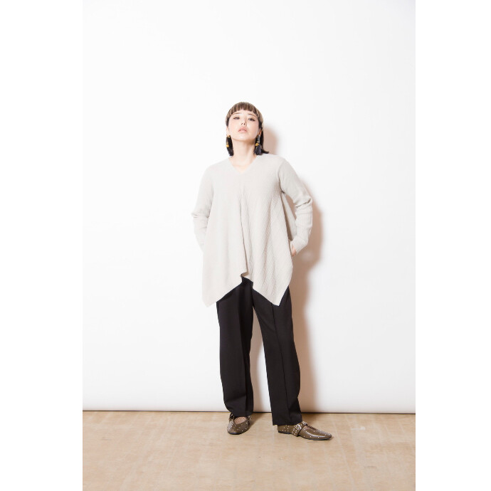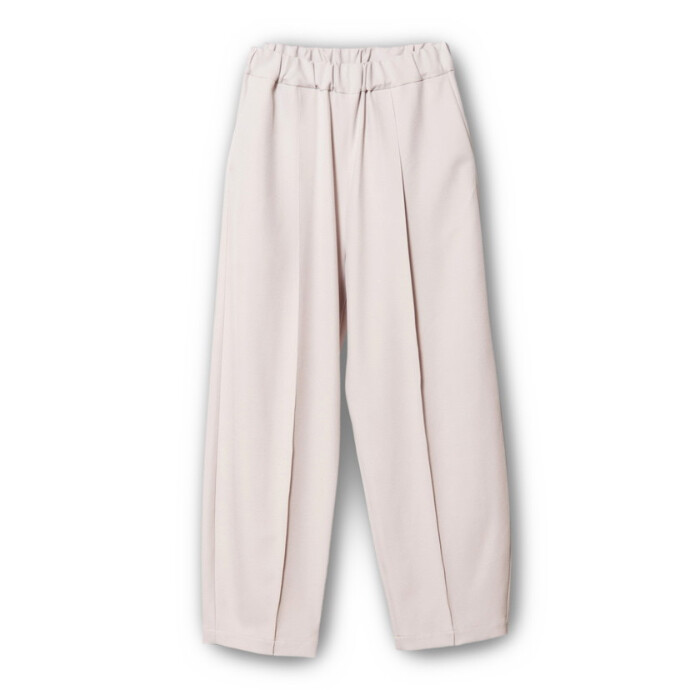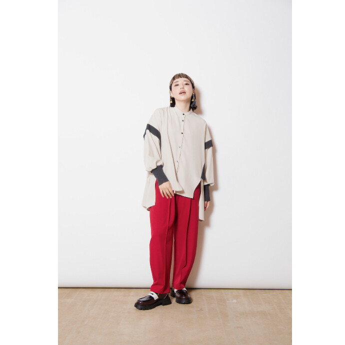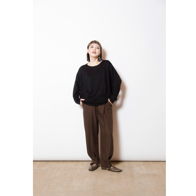 ルーズなカーブパンツにピンタックを施して、品行方正な印象にスタイルチェンジ。
