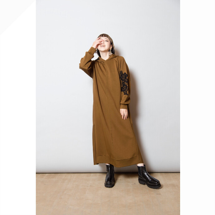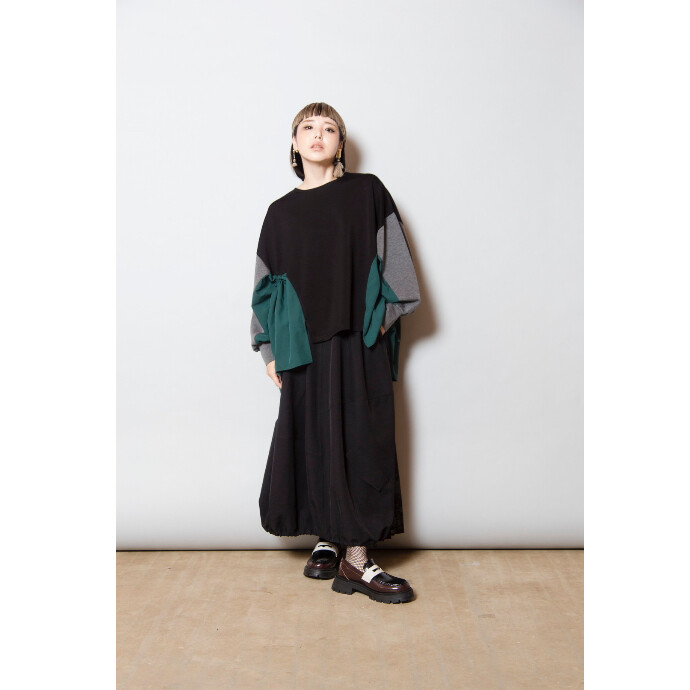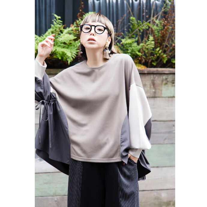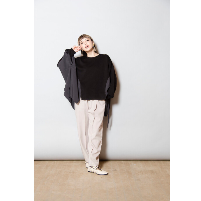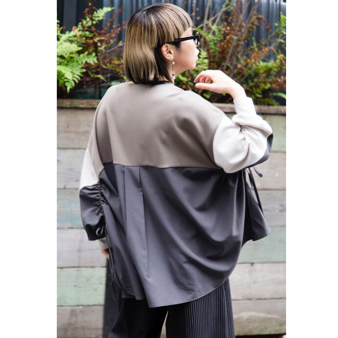 大胆な程にビッグサイズのプルオーバーは、異素材切替とたっぷりのギャザーを寄せてフェミニンさもプラス。
