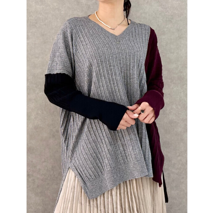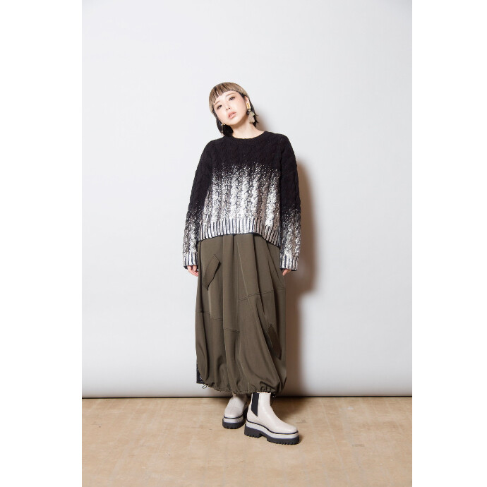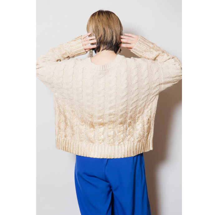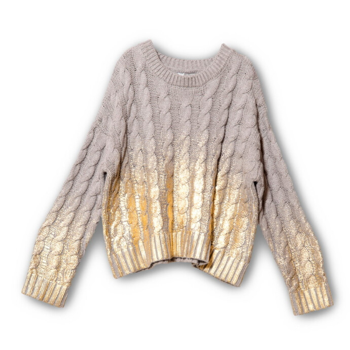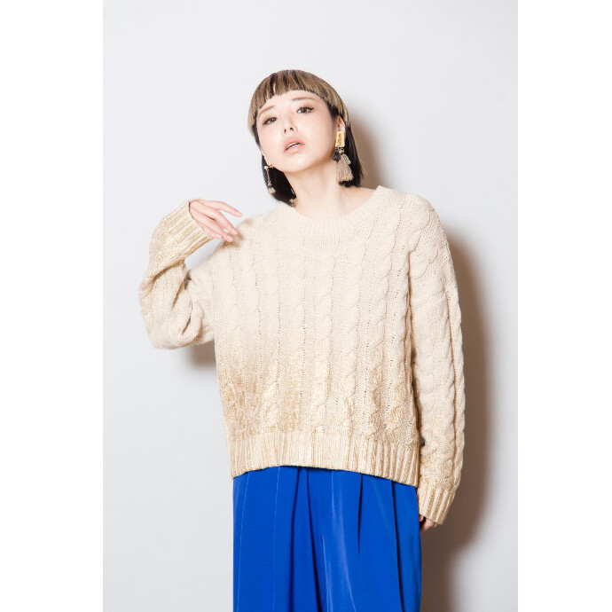 プレーンなケーブルニットに箔のグラデーションで、一気にグランジムードに。