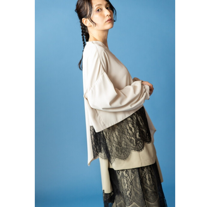 左右異なるヘムデザインでレースの甘さとモードさを融合。