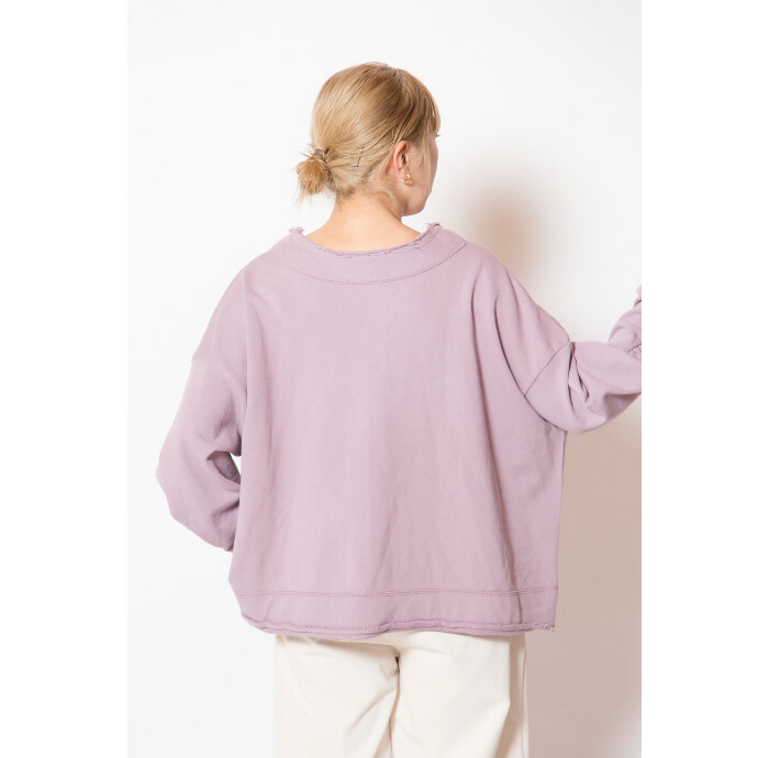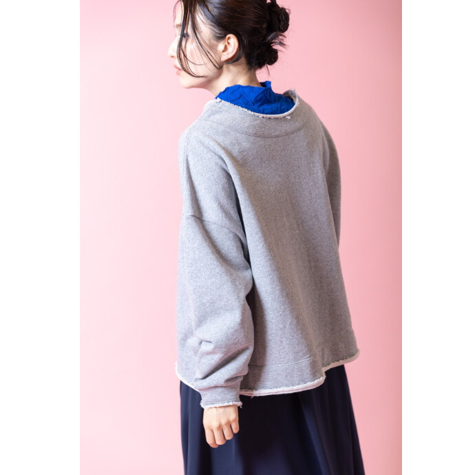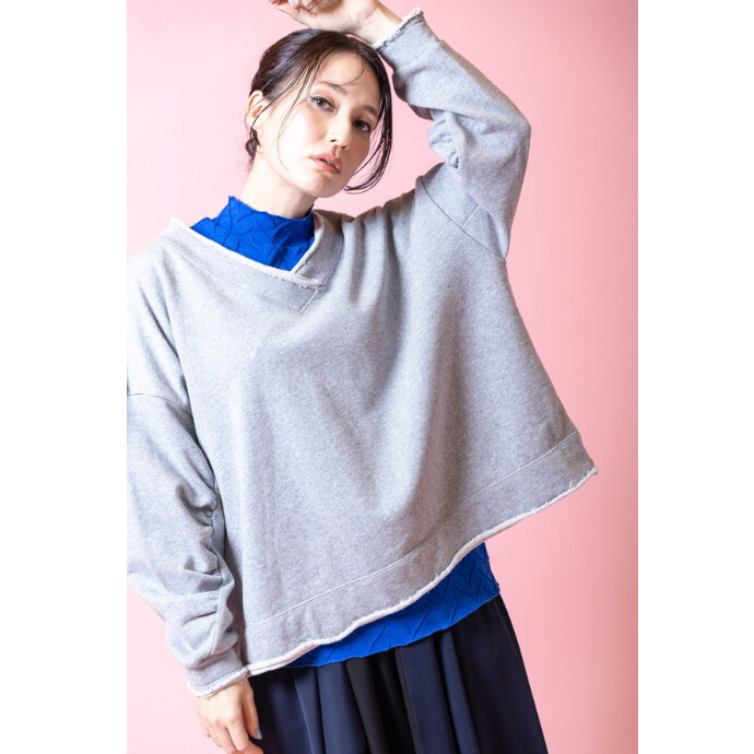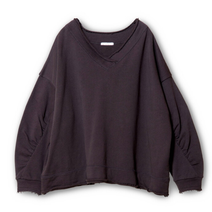 ラフな裏毛スウェットを、Vネックやタックスリーブで女性らしく再構築。