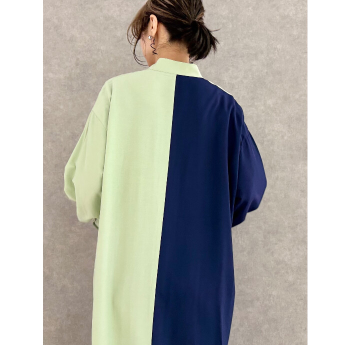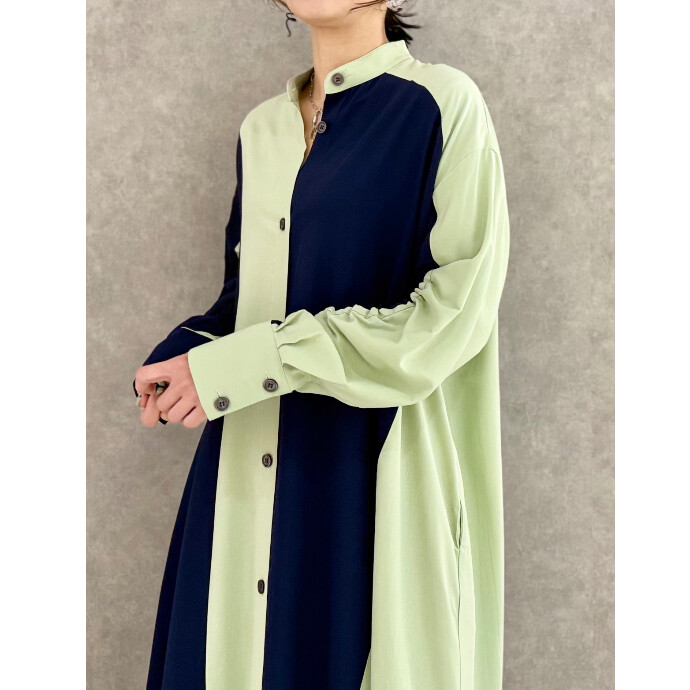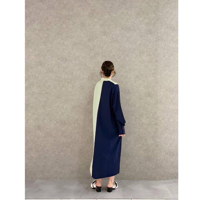 大胆に切替えたカラーやドローコードを効かせたギャザースリーブが、モードを感じるワンピース。
