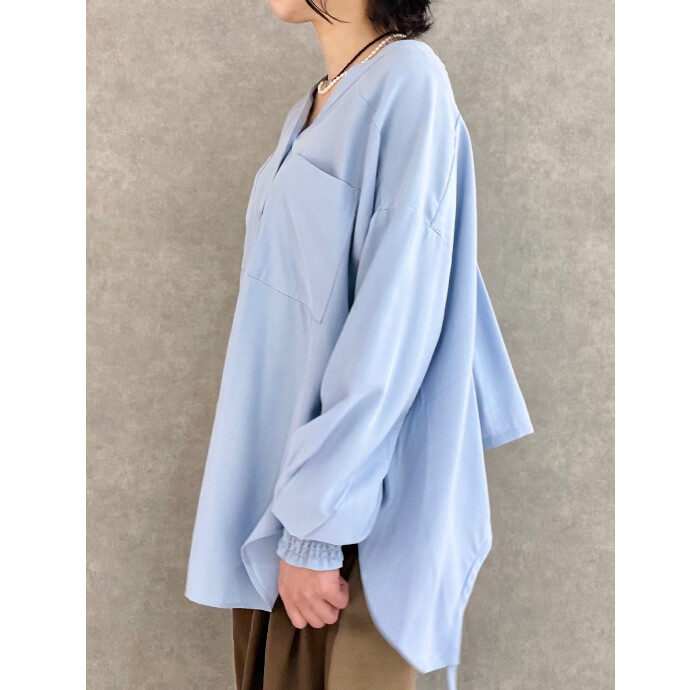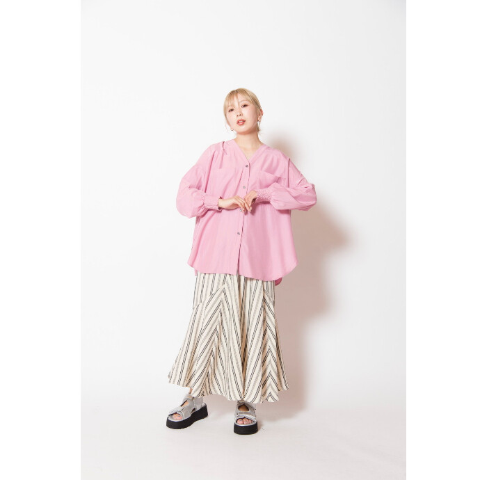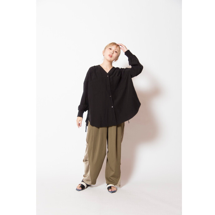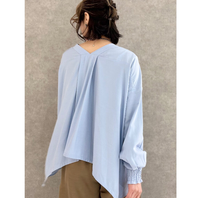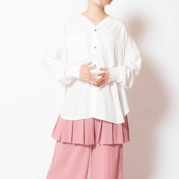 スッキリしたVネックに、袖口のギャザーやドロストヘムで甘さもプラス。
