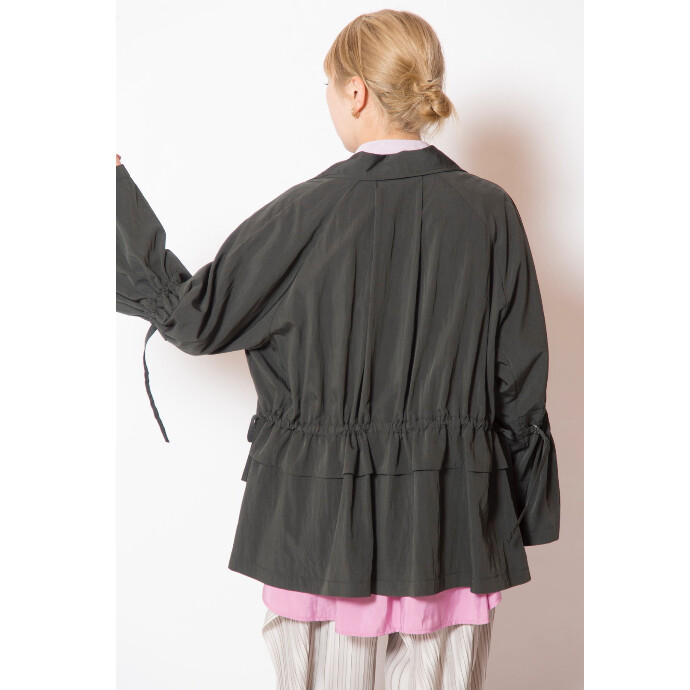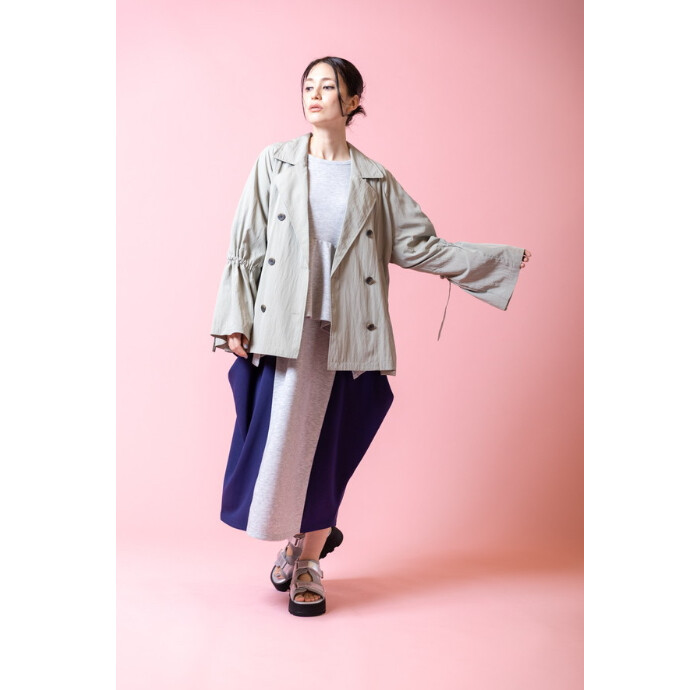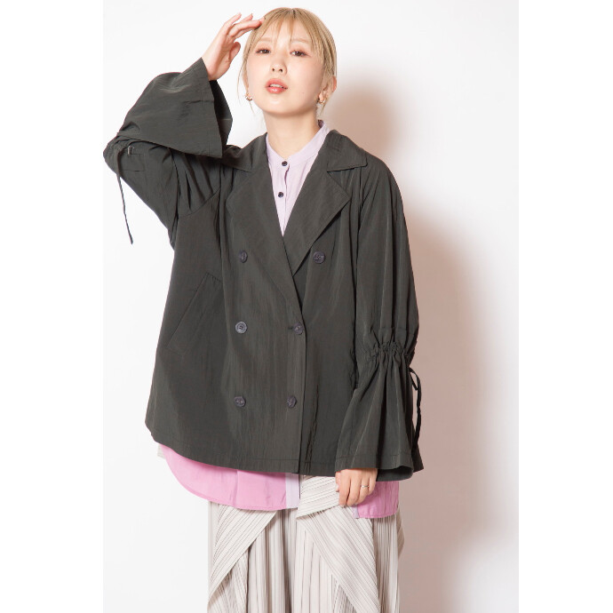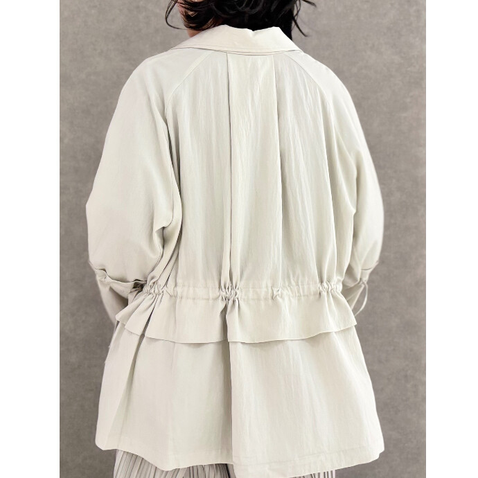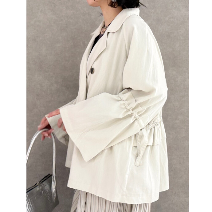 春らしいショートトレンチは、袖やバックにあしらったギャザーがアクセント。