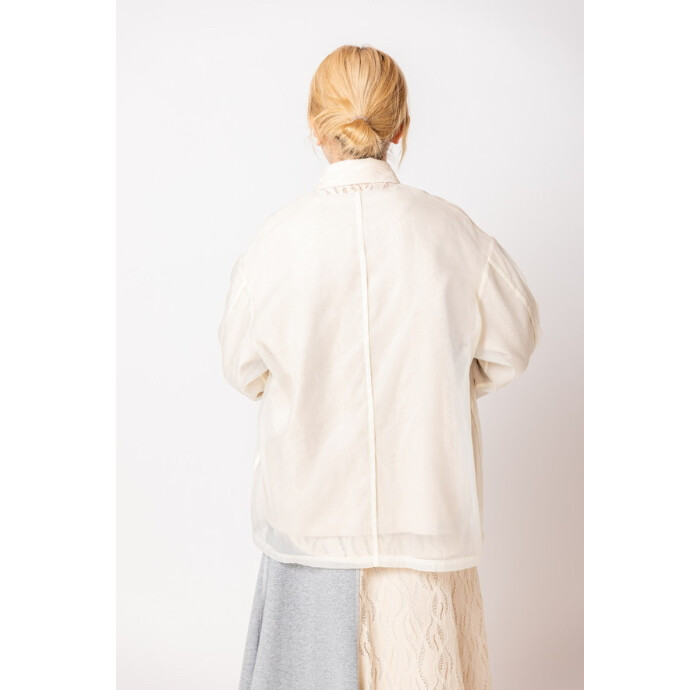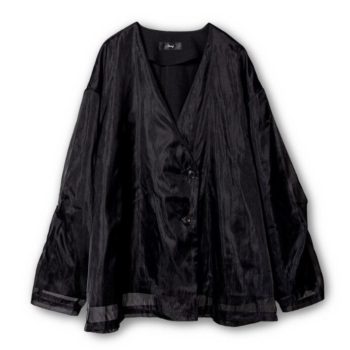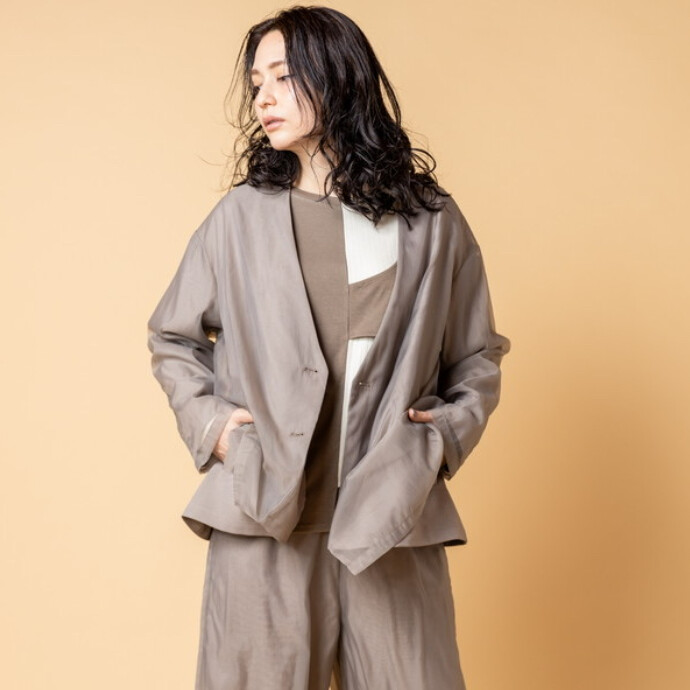 すっきりとしたノーカラーと上品な光沢感が、フォーマルシーンにも対応するジャケット。