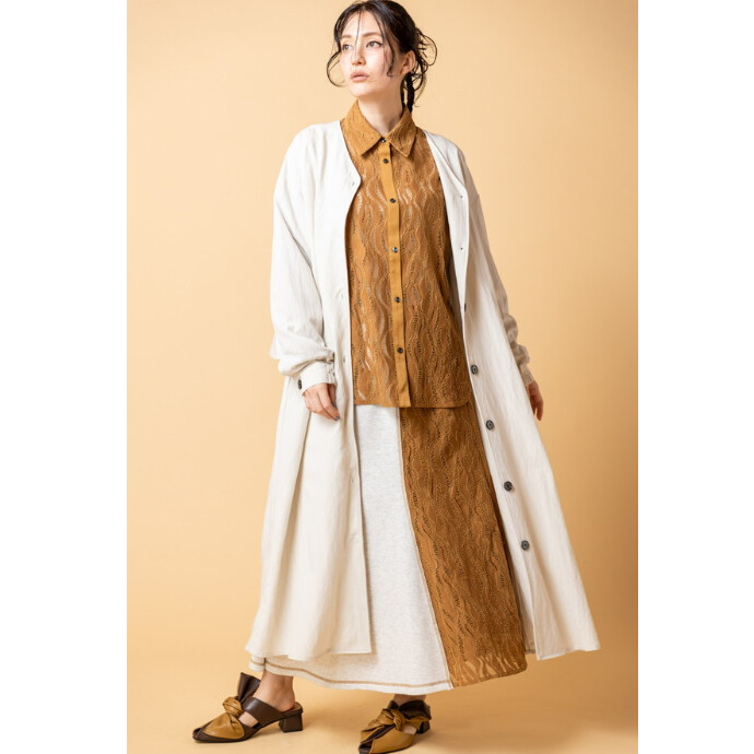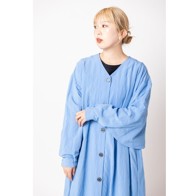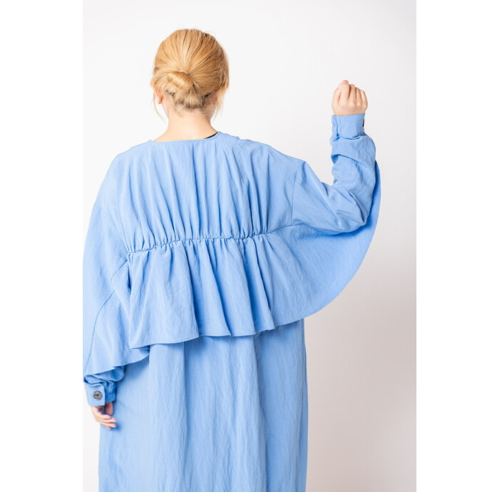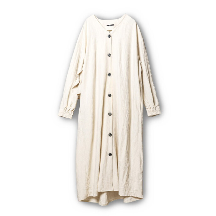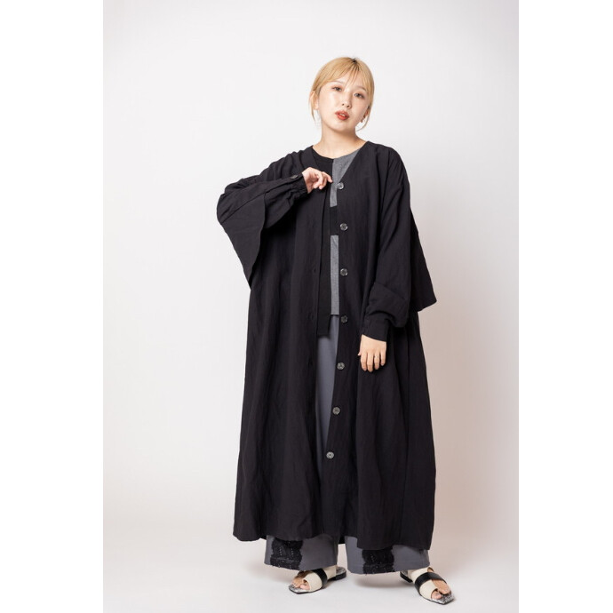 一見ワンピースを思わせるコートは、大ぶりなバックギャザーから袖まで流れるシルエットが印象的。