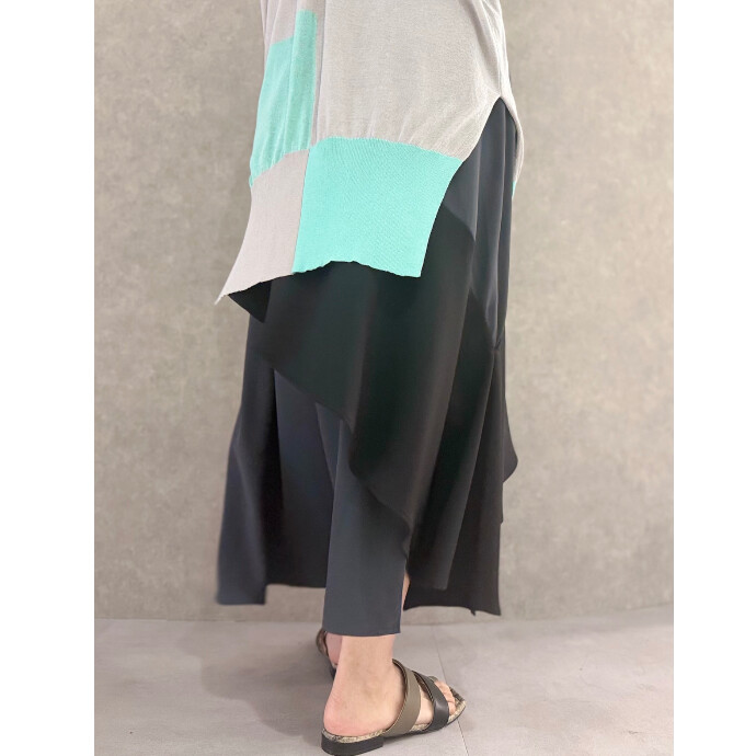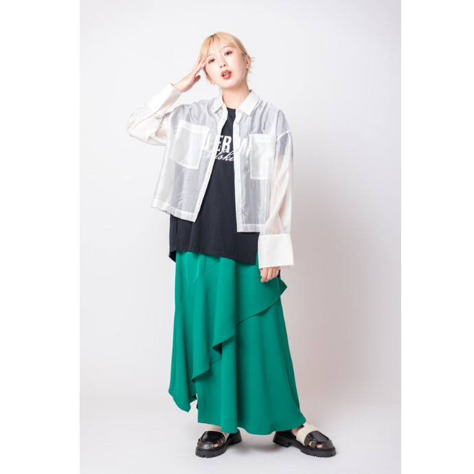 流れるようなラッフルフリルを施したスカートは、歩くたびに表情を変えるシルエットが印象的。