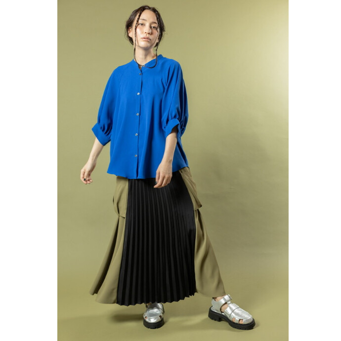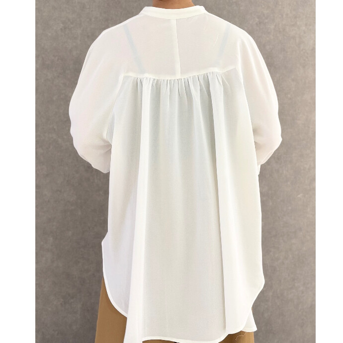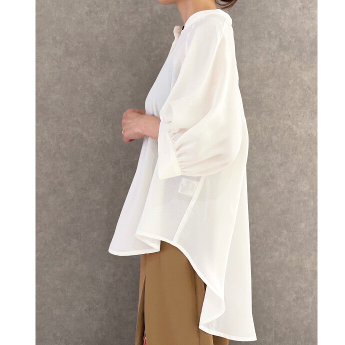 ふんわりとしたボリュームスリーブとバックギャザーが、さりげない立体感を演出。