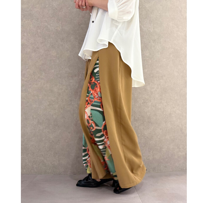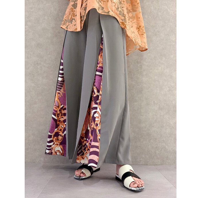 素材について: シワになりにくく、裏がなくとも透けにくい素材/ほのかに光沢のあるスカーフプリント地