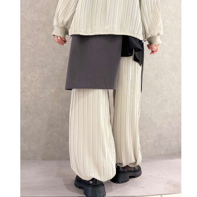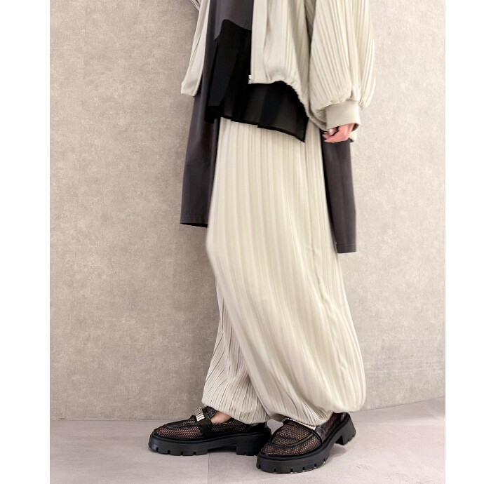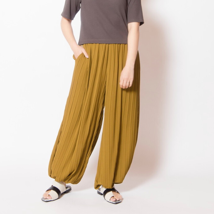 今季注目のバルーンパンツは、ランダムプリーツが生むたっぷりなドレープが印象的なハーレムシルエット。