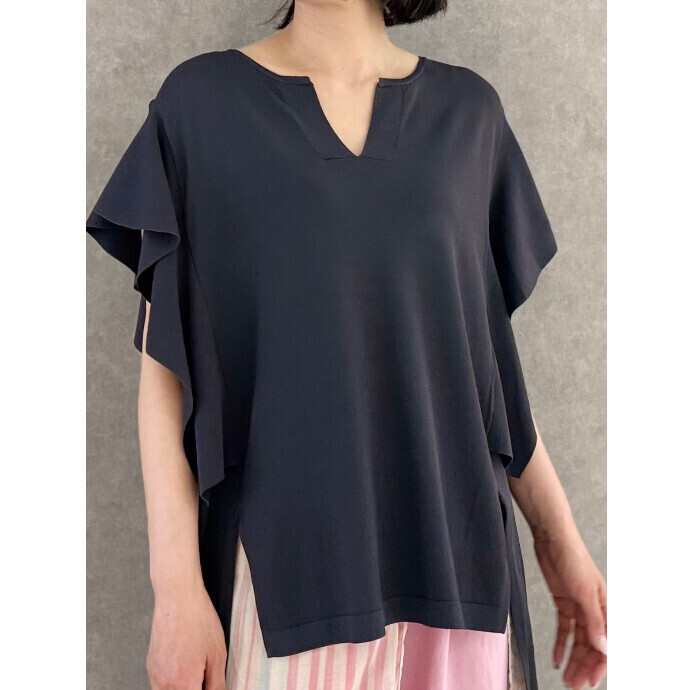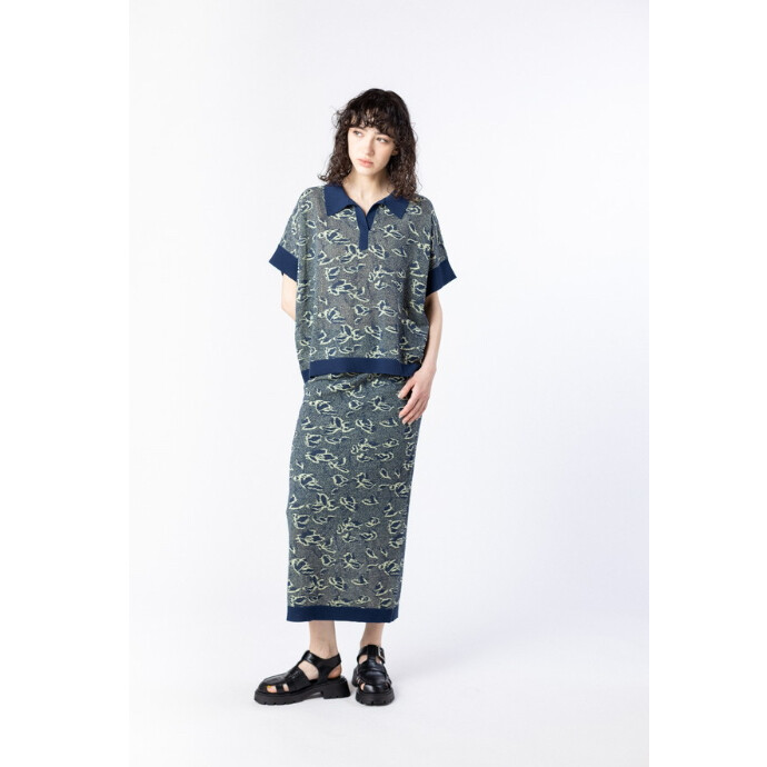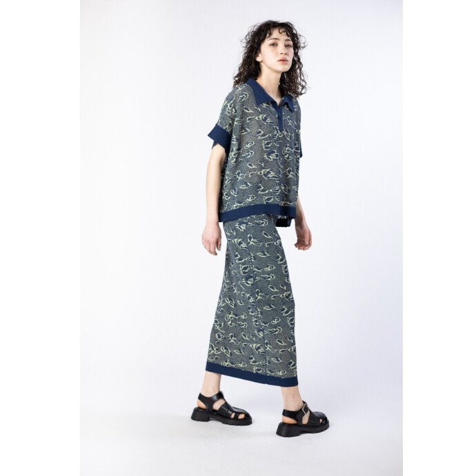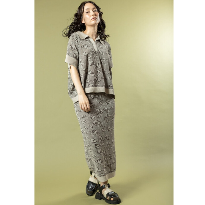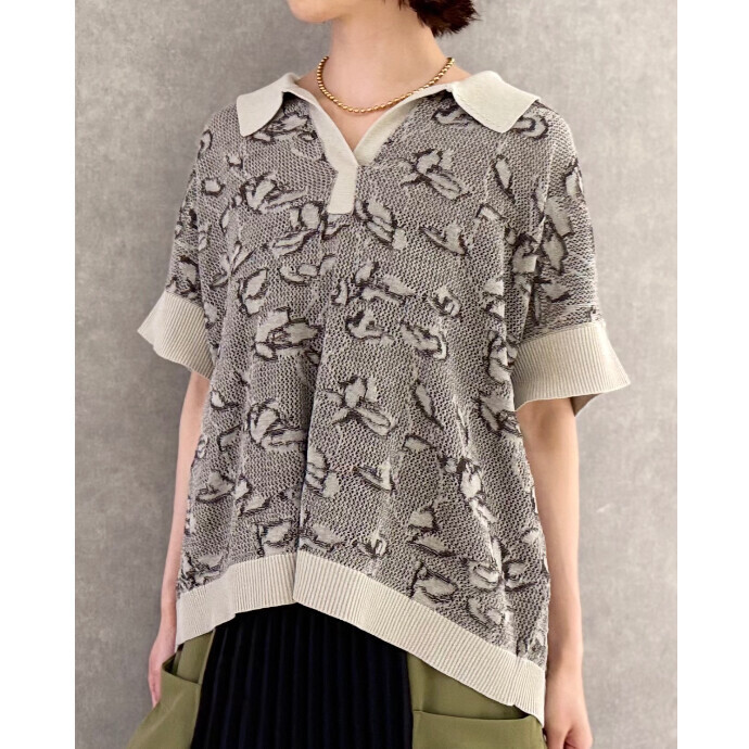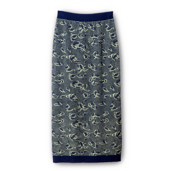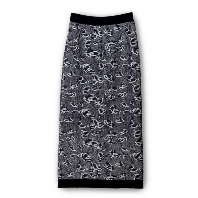 甘さを払拭する抽象的なジャガード柄がモードな雰囲気。