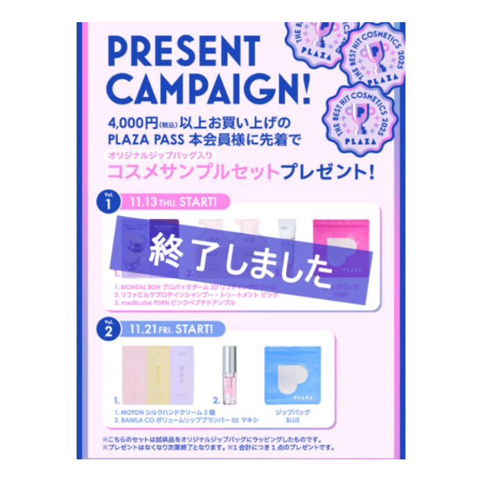 更にベスコス受賞を記念して、4,000円(税込)以上お買い上げのPLAZA PASS会員様に先着でコスメサンプルのプレゼントキャンペーンを開催いたします💞