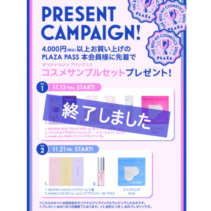 更にベスコス受賞を記念して、4,000円(税込)以上お買い上げのPLAZA PASS会員様に先着でコスメサンプルのプレゼントキャンペーンを開催いたします💞