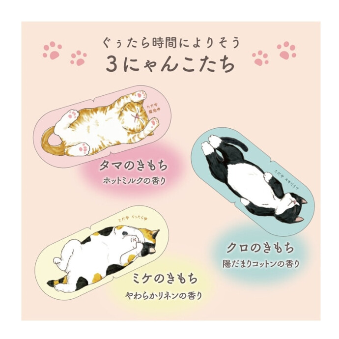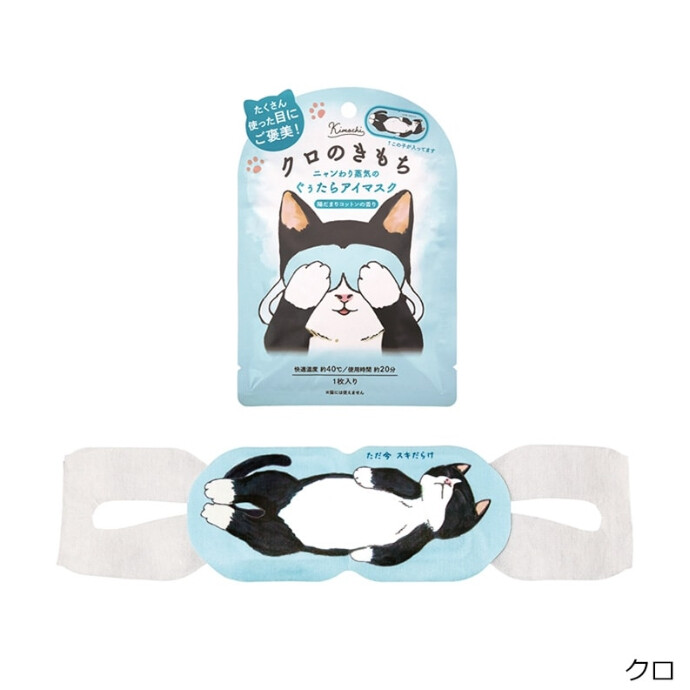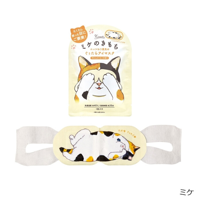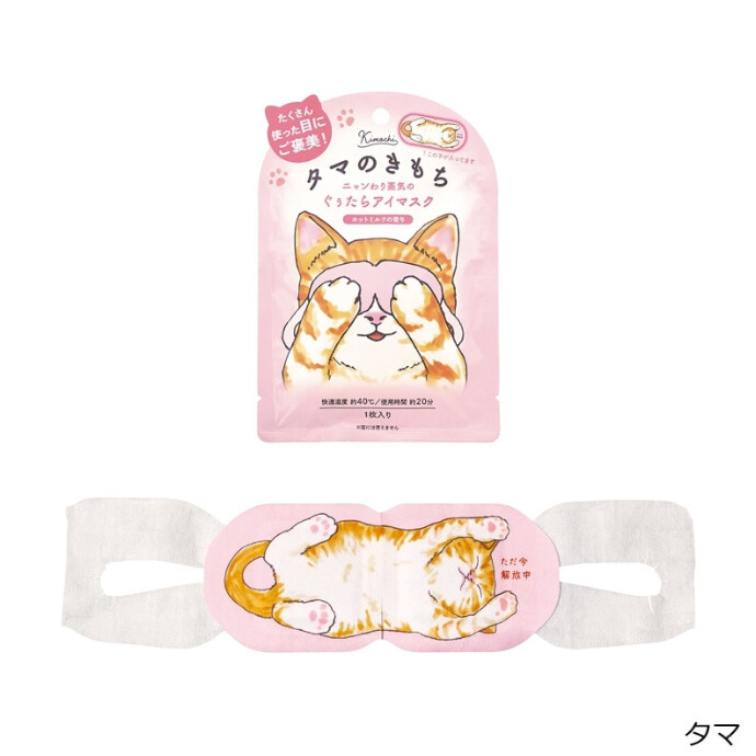 あったかい蒸気で疲れた目元をじんわり癒す、ほんわかやさしい香りのアロマホットアイマスク。約40℃の快適温度が20分程度持続。くつろぎモードの茶トラ、ハチ割れ、三毛猫のイラストが付いたユニークなデザインにも癒されます。勉強やデスクワークの合間の休憩時間のお供にどうぞ。選べる3種の香り。