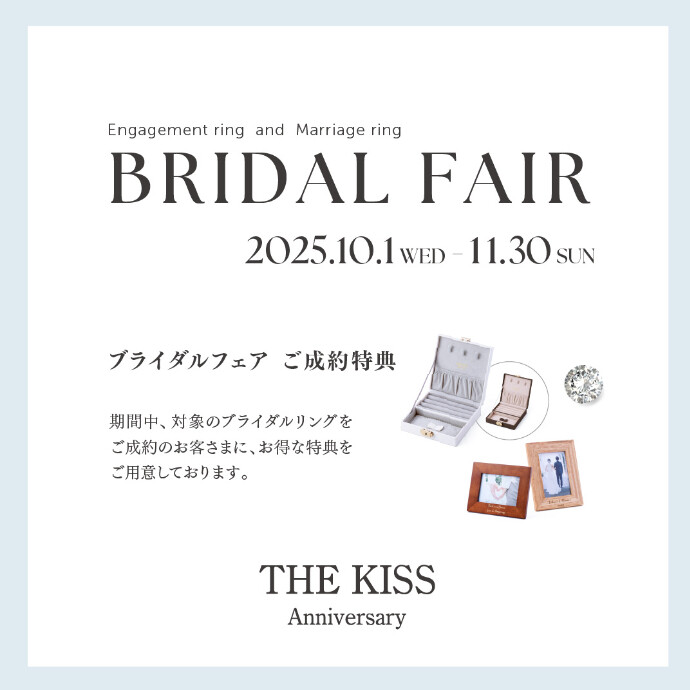 2025年10月1日(水)〜2025年11月30日(日)までの期間中、THE KISS Anniversaryのブライダルリングをご成約のお客さまに、お得な特典をご用意しております。