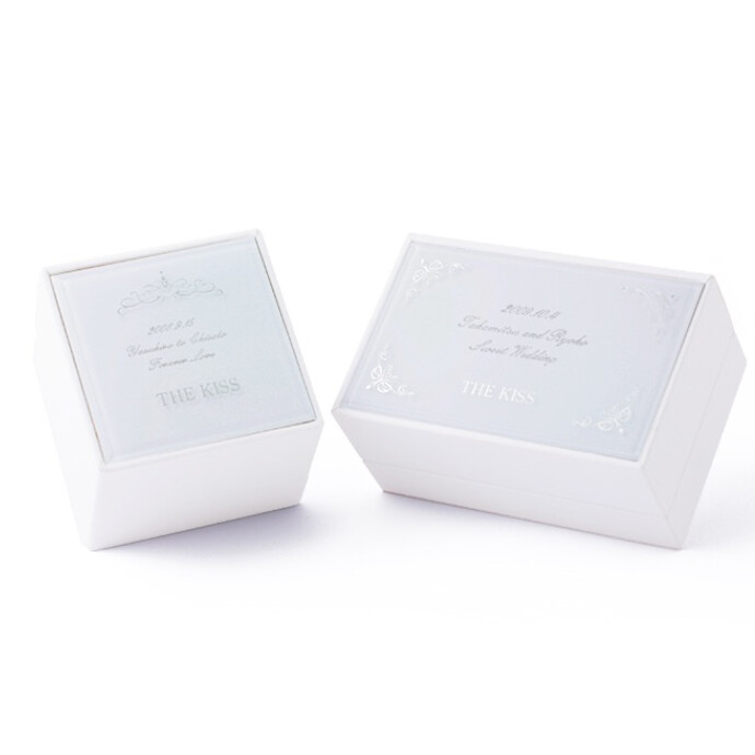 専用のジュエリーボックスに、おふたりの記念日やお名前、メッセージ(3種類から選択)を刻印するサービスをご用意しています。