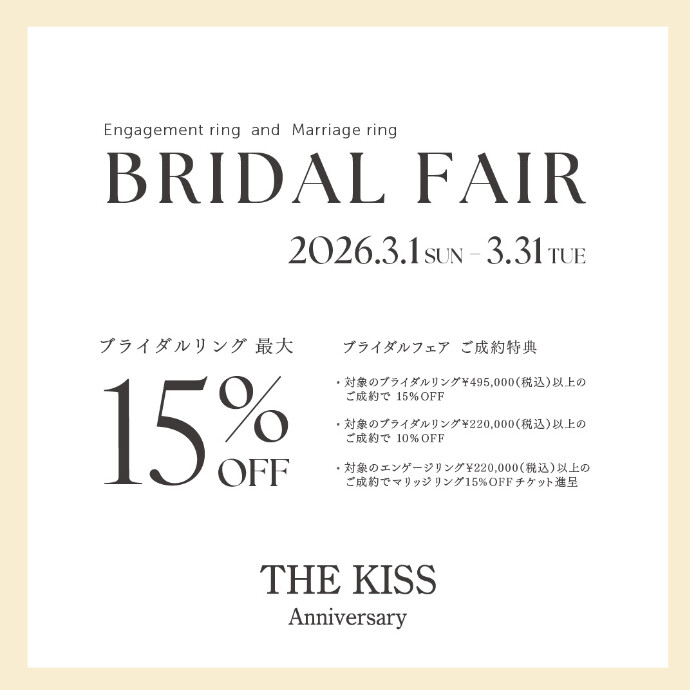 2026年3月1日(日)〜 2026年3月31日(火)までの期間中、THE KISS Anniversaryのブライダルリングをご成約のお客さまに、お得な特典をご用意しております💍💐