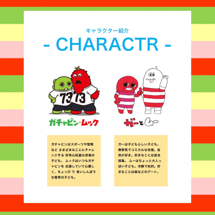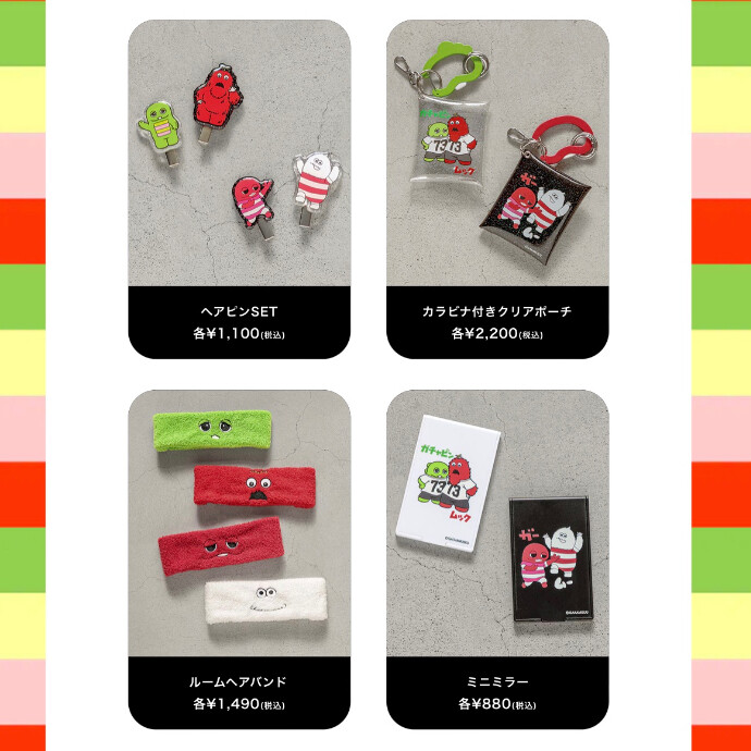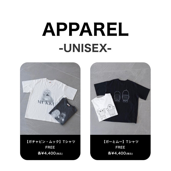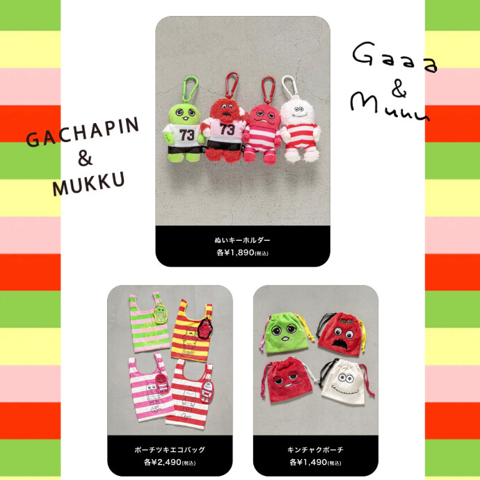 ガチャピン・ムックはもちろん、ガーとムーも仲間入りし、小物やTシャツなど様々なアイテムをご用意しております。