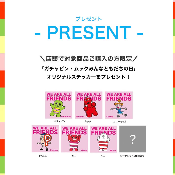 更に、今回は店舗で対象商品をご購入いただいたお客様に「ガチャピン・ムックみんなともだちの日」オリジナルステッカーをプレゼント!