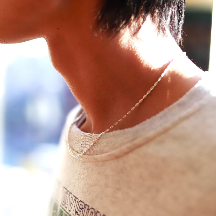 ■40cmはチョーカー感覚で古着に合わせたいラフな着こなしのスパイスに。重ね付けにも重宝する長さ40cm。これぐらいさりげないチェーンは毎日つけても飽きがこない。
