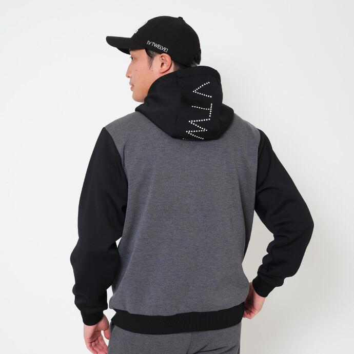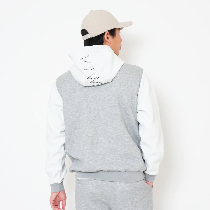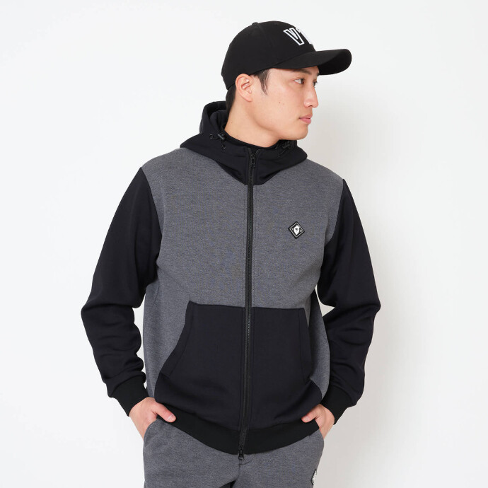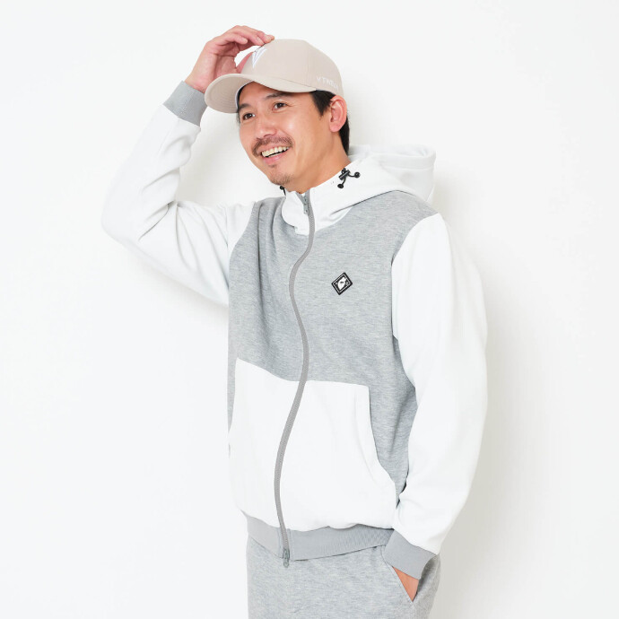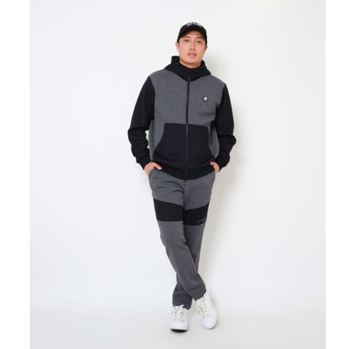 異素材切り替えが特徴のフルジップパーカー&パンツ。