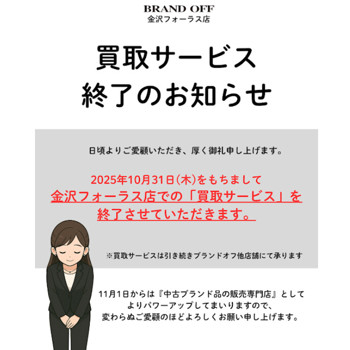 2025年10月31日をもちまして、金沢フォーラス店での「買取サービス」を終了させていただきます。